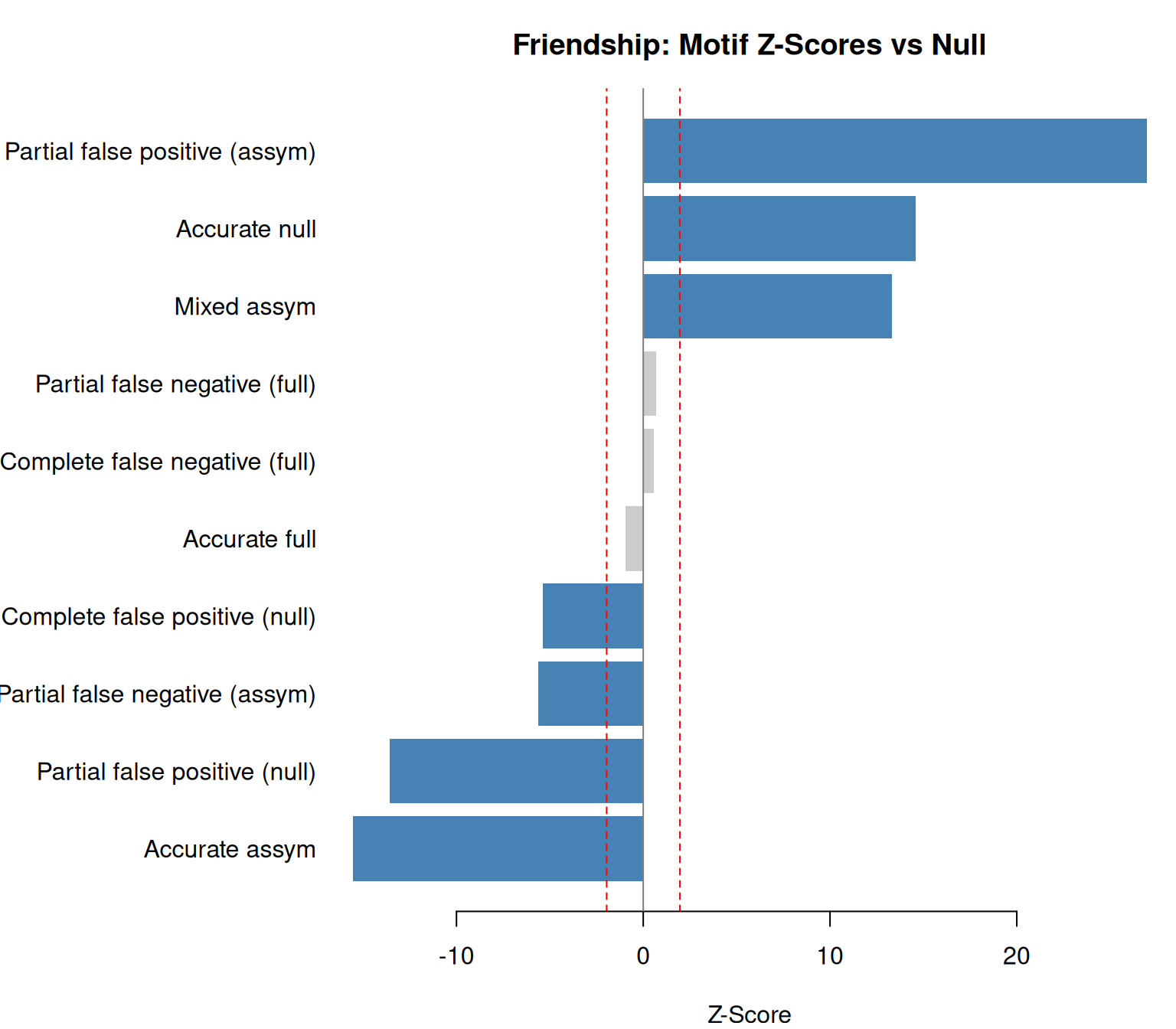 plot(friendship_test, main = "Friendship: Motif Z-Scores vs Null")