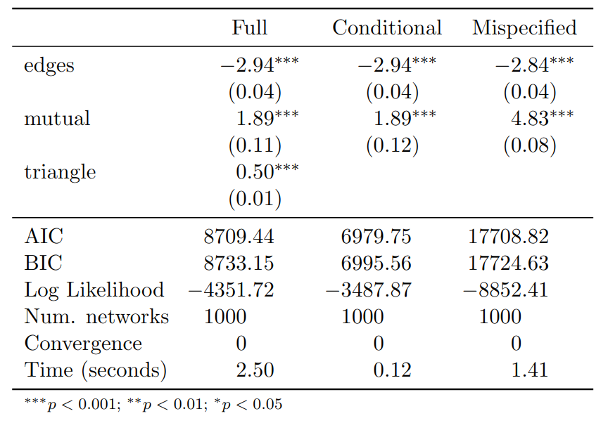 Vega Yon, George G., Andrew Slaughter, and Kayla de la Haye. 2021. “Exponential Random Graph Models for Little Networks.” Social Networks 64 (August 2020): 225–38. https://doi.org/10.1016/j.socnet.2020.07.005.