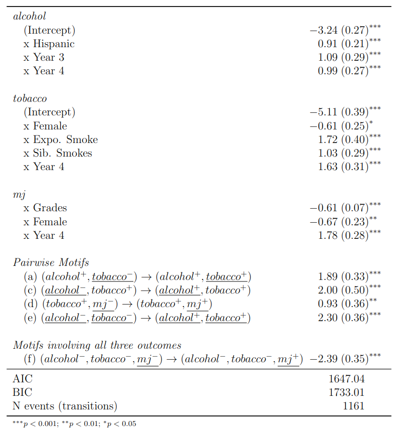 • We can use the ERGM framework for modeling vectors of binary outcomes, e.g., the consumption of \{tobacco, MJ, alcohol\}